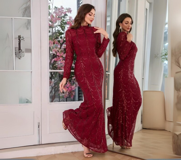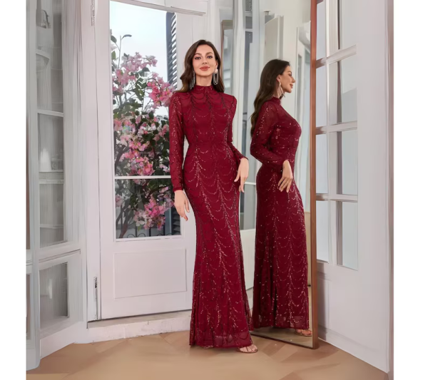 Elegant Women’S Deep Red Sequin Long Sleeve Gown