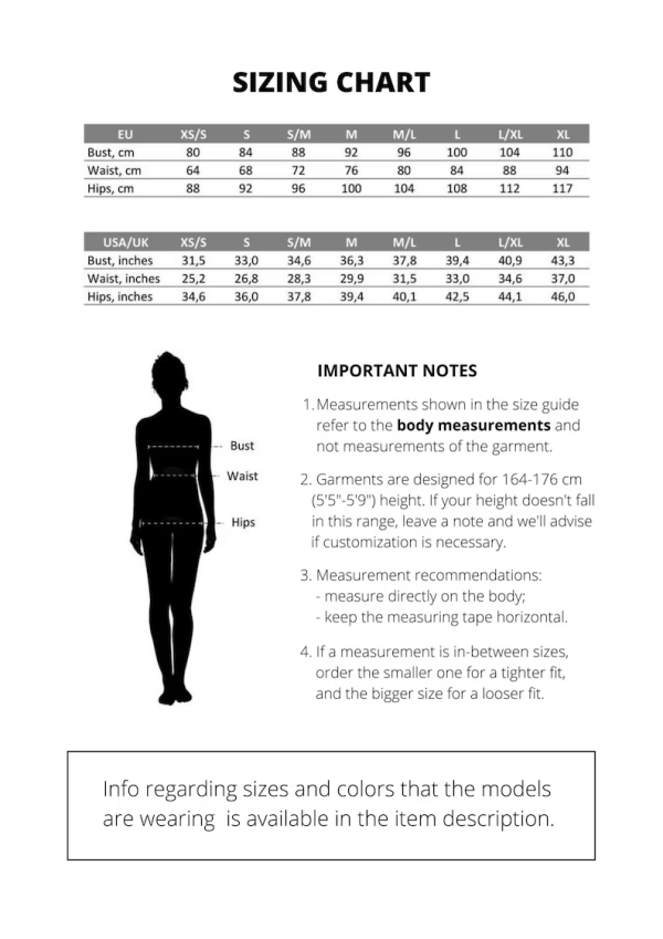 • Model wears size S/M in color Black Grey Str. She is 176 cm (5’9”). Bust – 83 cm (33”), waist – 62 cm (24”), hips – 90 cm (35”).