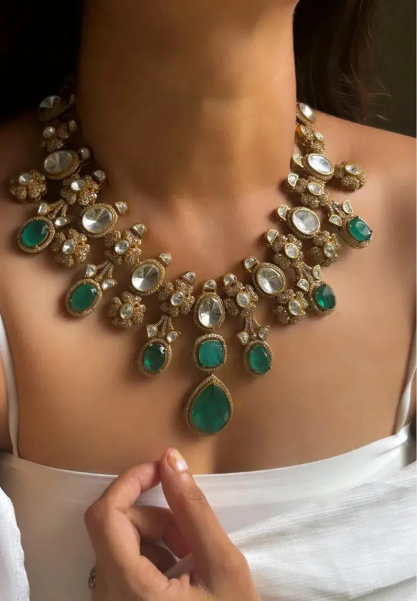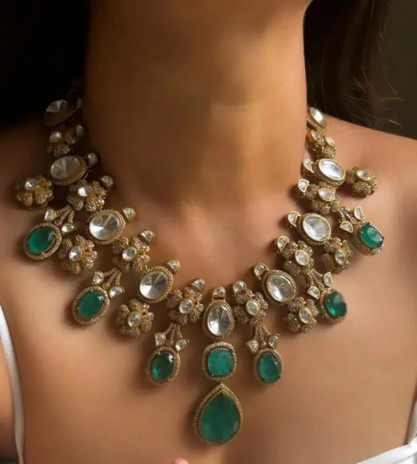 Stunning and gorgeous, Uncut Moissanite Polki studded very fine quality Sabyasachi necklace with matching earrings in popular emerald green color