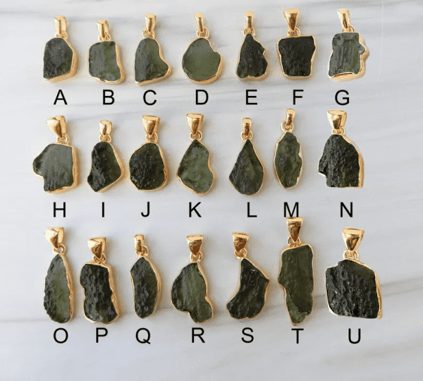 Beautiful genuine raw moldavite necklace. Genuine raw moldavite stones are set into gold vermeil (14k gold over sterling silver) Add a 14k gold filled chain in your choice of styles in the length of your choice. Moldavite is a meteorite, formed 14.7 million years ago during a massive meteorite impact. Therefore it is considered meteorite glass also know as Tektite. Moldavite has a unique deep green color ranging from forrest to olive green. These stones are all natural and each has a unique formation. All of my moldavite is authentic purchased directly from a legal certified suppler in the Czech Republic and is genuine moldavite.