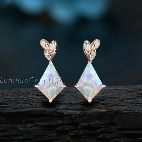 The earrings main stone is 6*9mm Round cut lab white Opal. The accent stones are lab Opal.